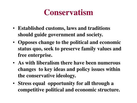 Conservatism is a political ideology that emphasizes tradition, order, and stability. It is typically associated with right-leaning politics and is characterized by a belief in limited government, individual responsibility, and free market capitalism. Conservatives tend to support lower taxes and fewer regulations on businesses, as well as traditional social policies, such as opposition to abortion and same-sex marriage. If you believe in the importance of tradition and personal responsibility, then you may align with conservatism.